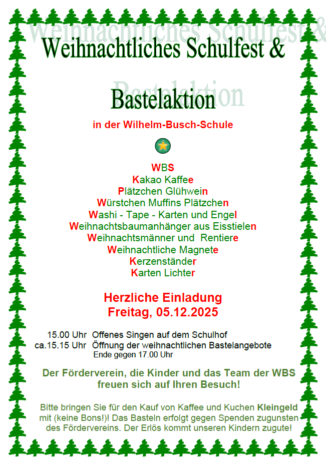 | Fr, | 05.12.2025 | Weihnachtliches Schulfest 15 - ca. 17 Uhr |