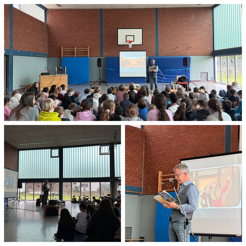 Vor zwei Jahren war in unserem Lesemonat März zum ersten Mal Autor Fabian Lenk zu Gast. Neben seinem Buch "Der Meisterdieb" - traditionell Lektüre unserer dritten Schuljahre - hat er andere bekannte Bücher wie die "1000 Gefahren"-Reihe oder die Reihe "Die Zeitdetektive" geschrieben. Ganz besonders haben wir uns gefreut, dass Herr Lenk uns nun wieder an der WBS besucht hat. Spannend und abwechslungsreich las er aus seinen Büchern vor und zog alle Zuhörenden in seinen Bann! In den Klassen hatten die Kinder Fragen vorbereitet, die sie Herrn Lenk danach stellen durften: Wie alt war er, als er sein erstes Buch geschrieben hat? Und wie lange schreibt man eigentlich an so einem Buch? Malt er alle Bilder dafür selber? Wie viele Bücher hat er schon verkauft? Und wie viele Bücher geschrieben? Herr Lenk nahm sich sehr viel Zeit für alle das, was die Kinder wissen wollten. Auch ein Autogramm durfte sich jedes Kind abholen. Herzlich bedanken wir uns bei Fabian Lenk für diesen tollen Schulmorgen und freuen uns schon jetzt, wenn er im Jahr 2028 wieder zu Gast bei uns sein wird!