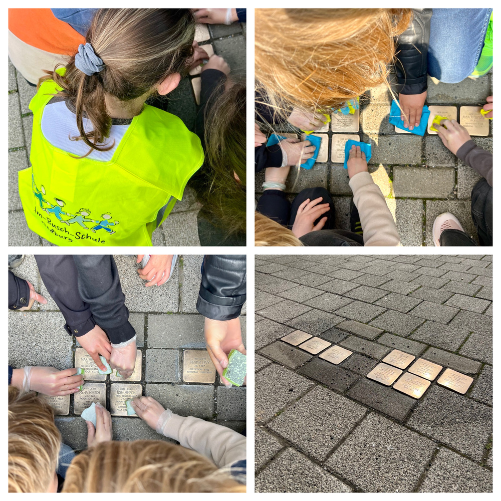 Seit dem Jahr 2021 haben wir die Patenschaft für die acht Stolpersteine in der Hundsgasse übernommen. Unsere vierten Schuljahre haben sich im Rahmen des Unterrichts mit dem Thema beschäftigt. Heute waren einige Kinder gemeinsam mit Frau Lenkewitz vor Ort und haben die Steine geputzt. Weitere Informationen rund um unsere Paternschaft befinden sich hier (bitte klicken).