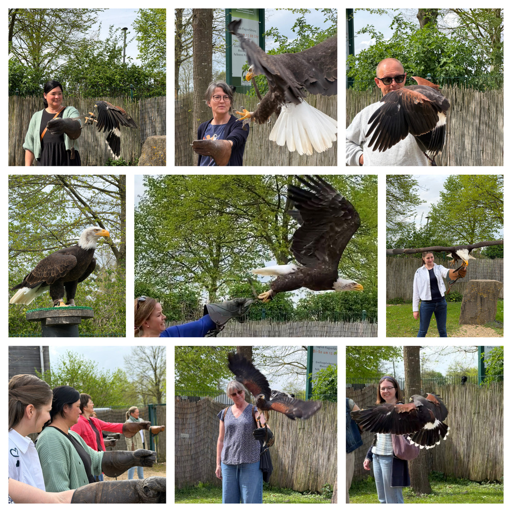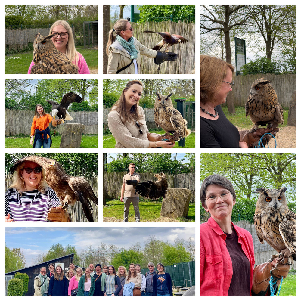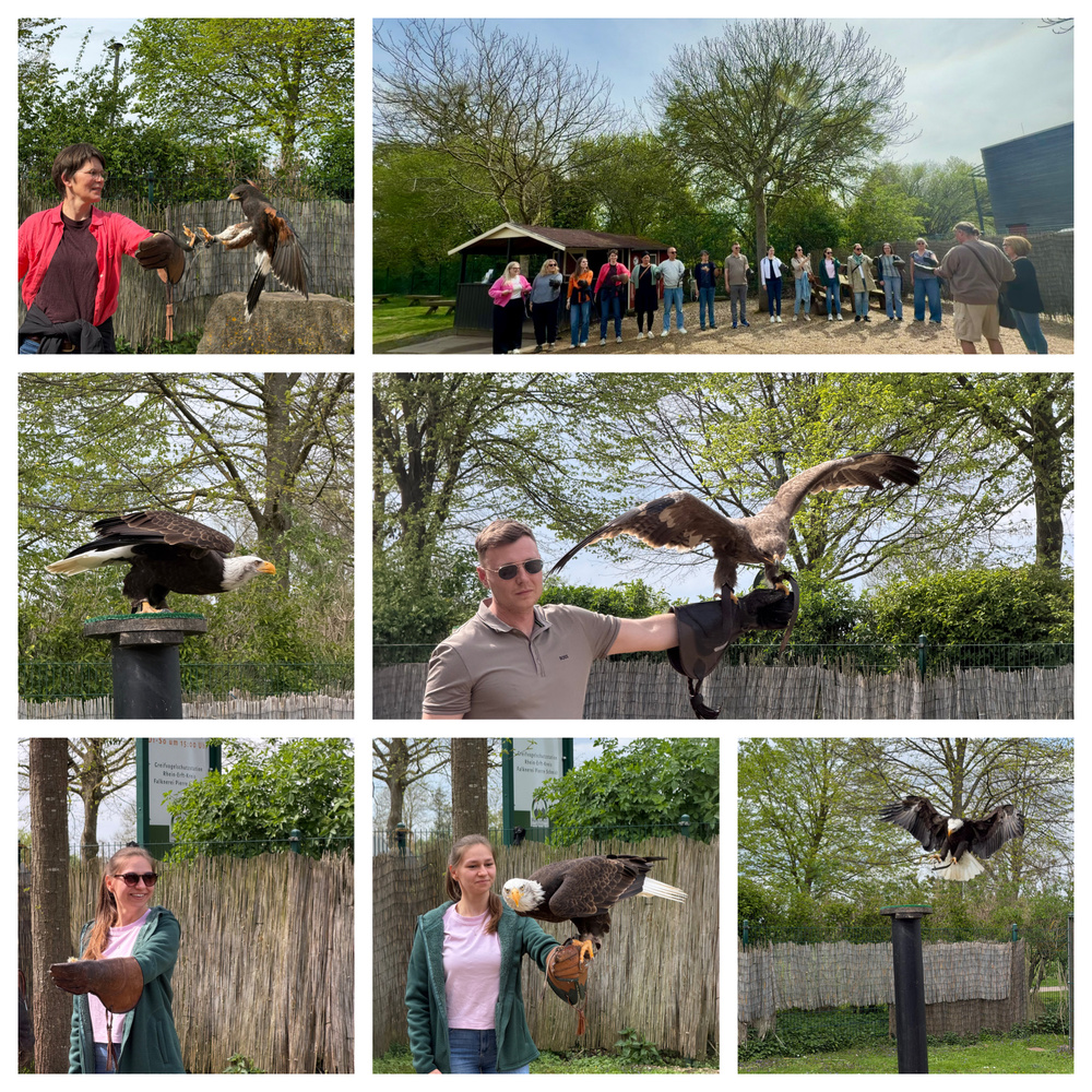 Teamausflug 2025/26 in die Falknerei Schloss Gymnich - Unser Team verbrachte einen spannenden Nachmittag mit Pierre Schmidt und seinem Team. Dabei erfuhren wir viel Spannendes rund um Greifvögel und durften - angeleitet vom Team der Falknerei - mit diesen wunderbaren Tieren arbeiten.